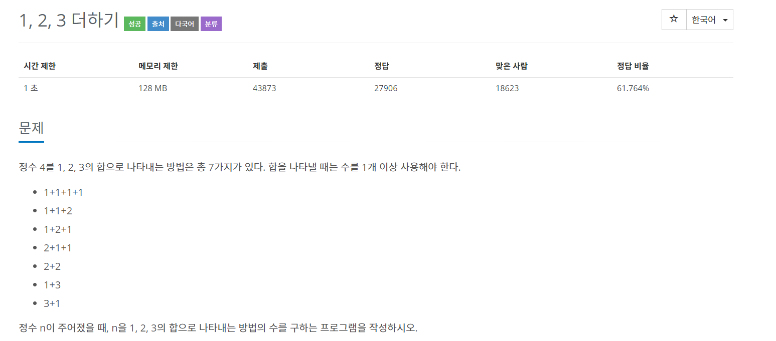 [๋ฐฑ์ค] 9095๋ฒ, 1,2,3 ๋ํ๊ธฐ(๋ค์ด๋๋ฏน ํ๋ก๊ทธ๋๋ฐ)