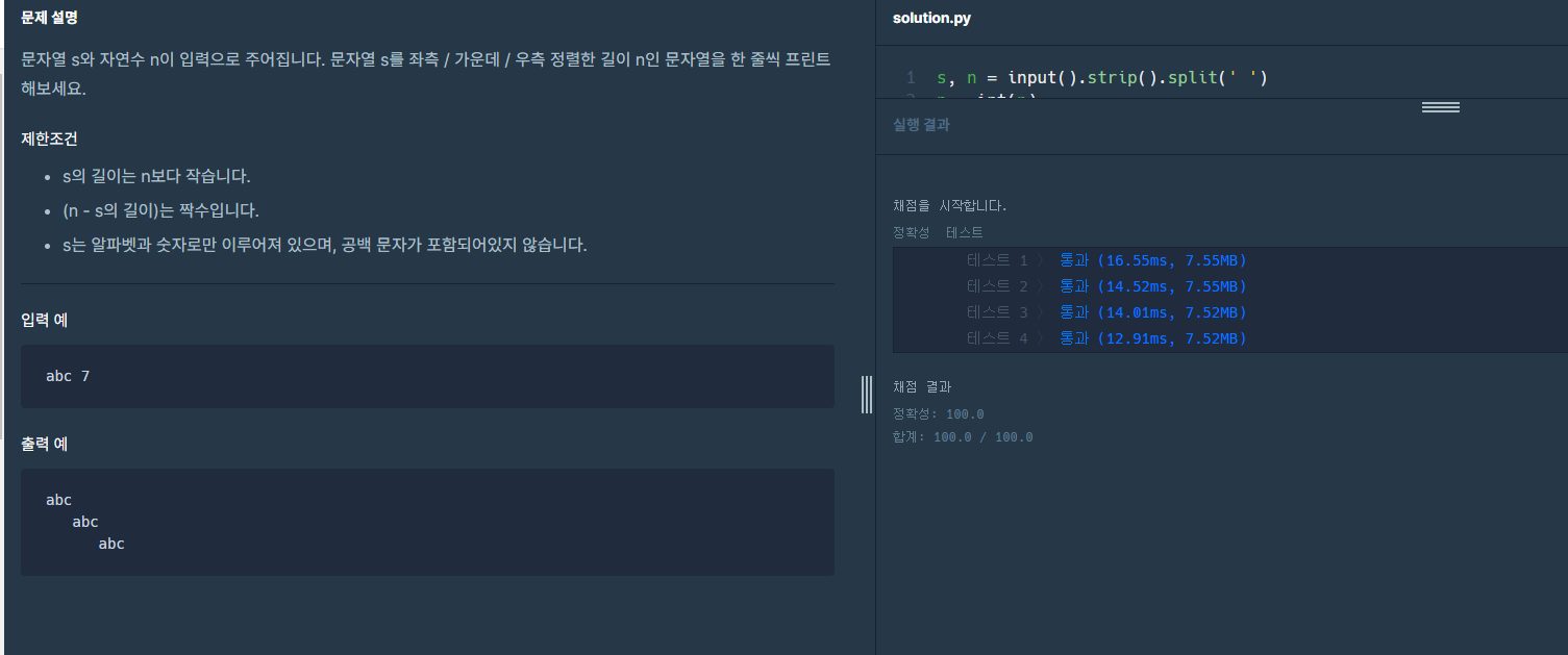 s.center(n) # ๊ฐ์ด๋ฐ ์ ๋ ฌ