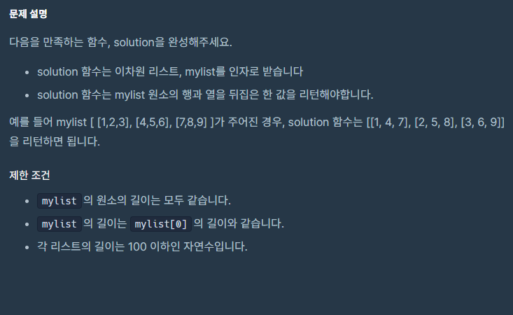 1 2 3 4 5 6 7 8 9 10 | def solution(mylist): ans = [] for i in range(len(mylist)): temp = [] for item in mylist: temp.append(item[i]) ans.append(temp) return ans | cs |