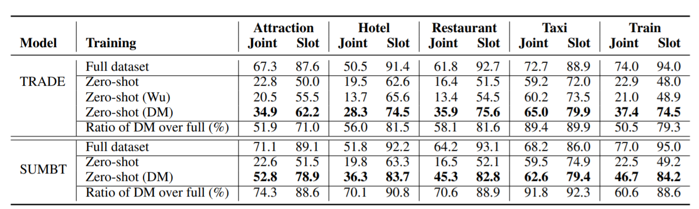 합성된 데이터로 모델을 학습시켰을 때 결과는 원래의 결과와 크게 다르지 않다. 하지만 Zero shot 방식(목적으로 하는 domain을 제외하고 학습시킨뒤, test는 목적으로 하는 domain으로 하는 방법)으로 모델을 테스트 했을 때는 TRADE가 1/2, SUMBT가 2/3 정도의 성능을 보였다.